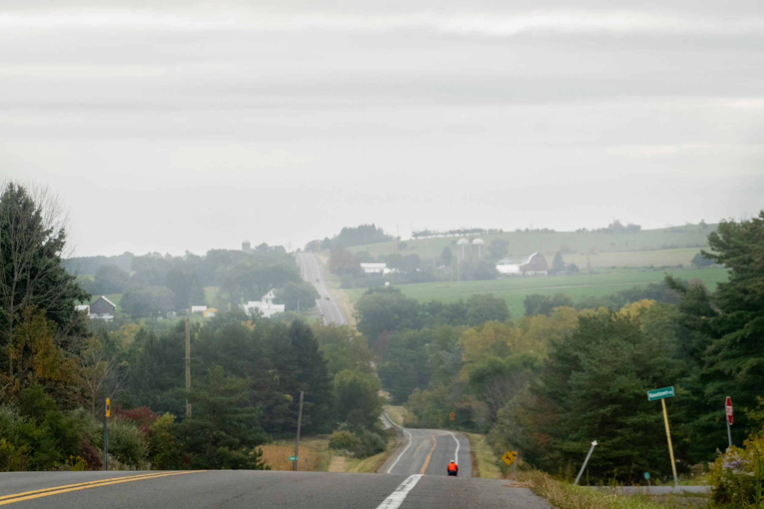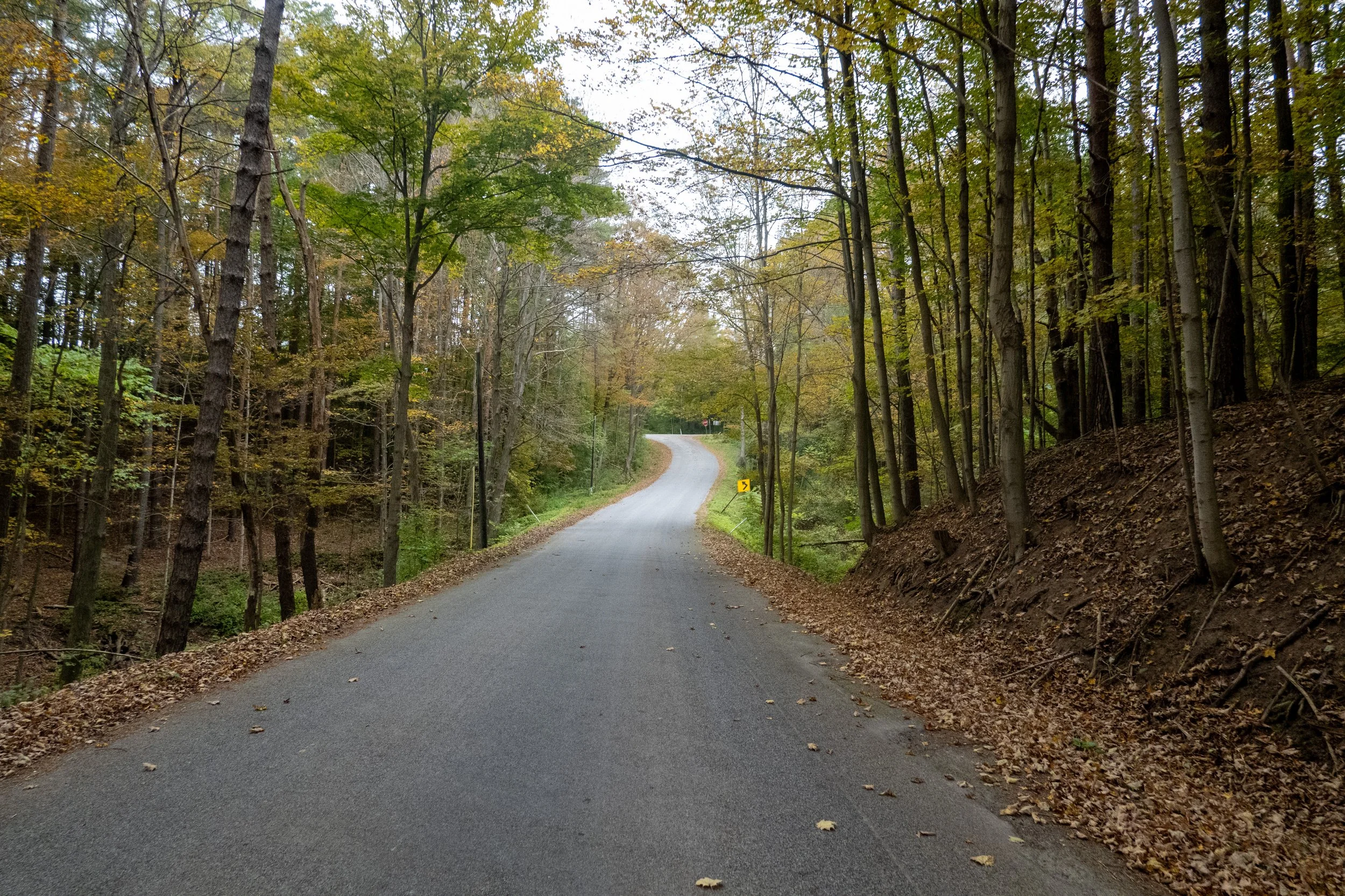 One of the things I love about bicycling in the northeast is the constant variation of the scenery. Here is a simple wooded back road going up a slight hill with gentle curves with leaves are starting to accumulate on the sides. It reminds me of biking near home.