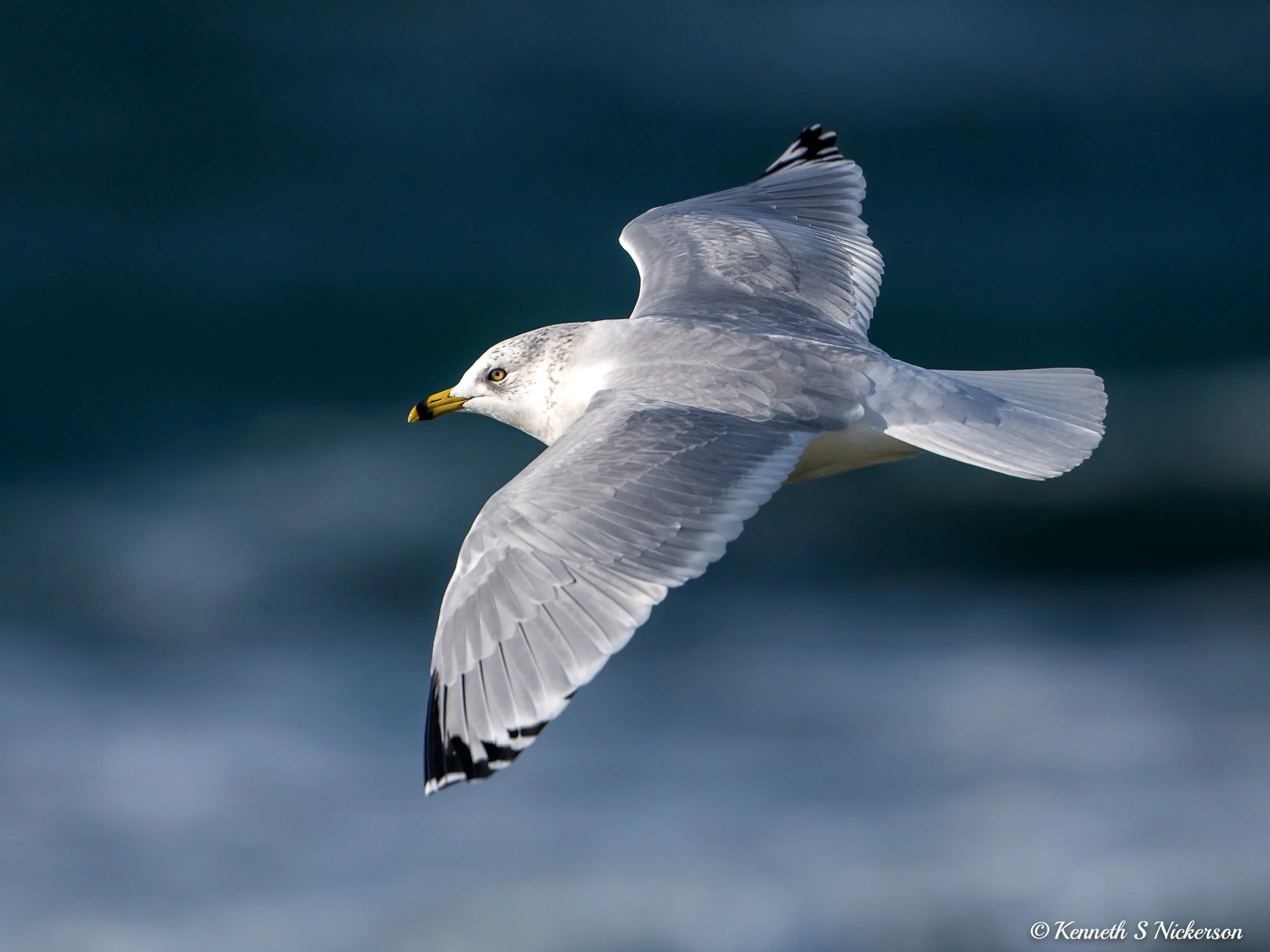 Here is a different example of a backlit American Herring Gull. What I find most interesting in this photo is the sharp texture of the reflected light in the wave versus the soft reflections in the more distant water.
