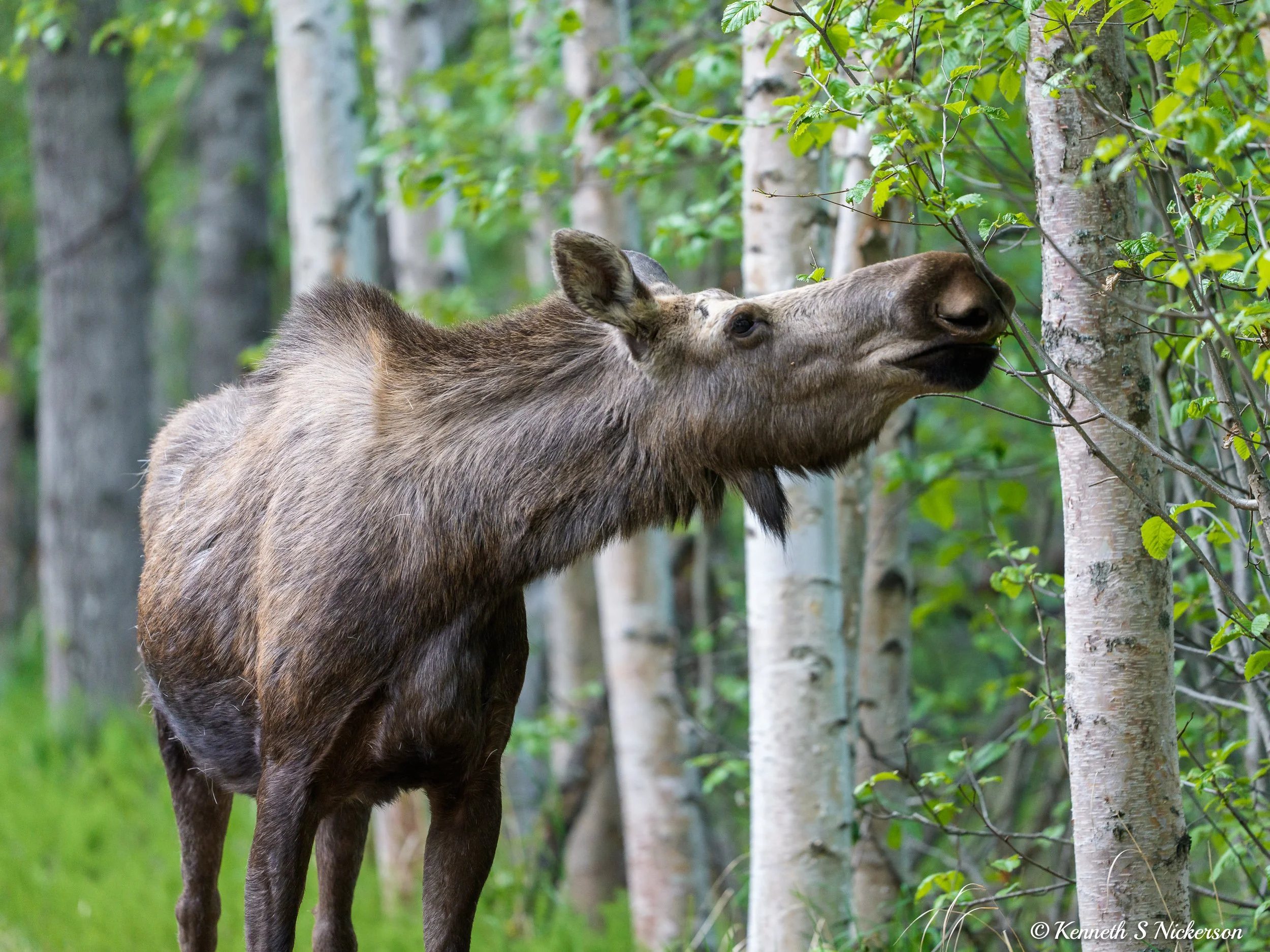 Once I got to the bay, I walked along the bike path towards downtown Anchorage. I met a woman also walking in the same direction and carrying photography gear. We talked as we walked. She was local, and when she heard I was from the lower 48, she asked if I had seen a moose yet. I told her no since I had just arrived yesterday afternoon. Well, probably no more than 20 paces later, she stopped and pointed to the right side of the path where there was a moose in the woods. I took this photo a few minutes later when the moose stepped out onto the edge of the path.