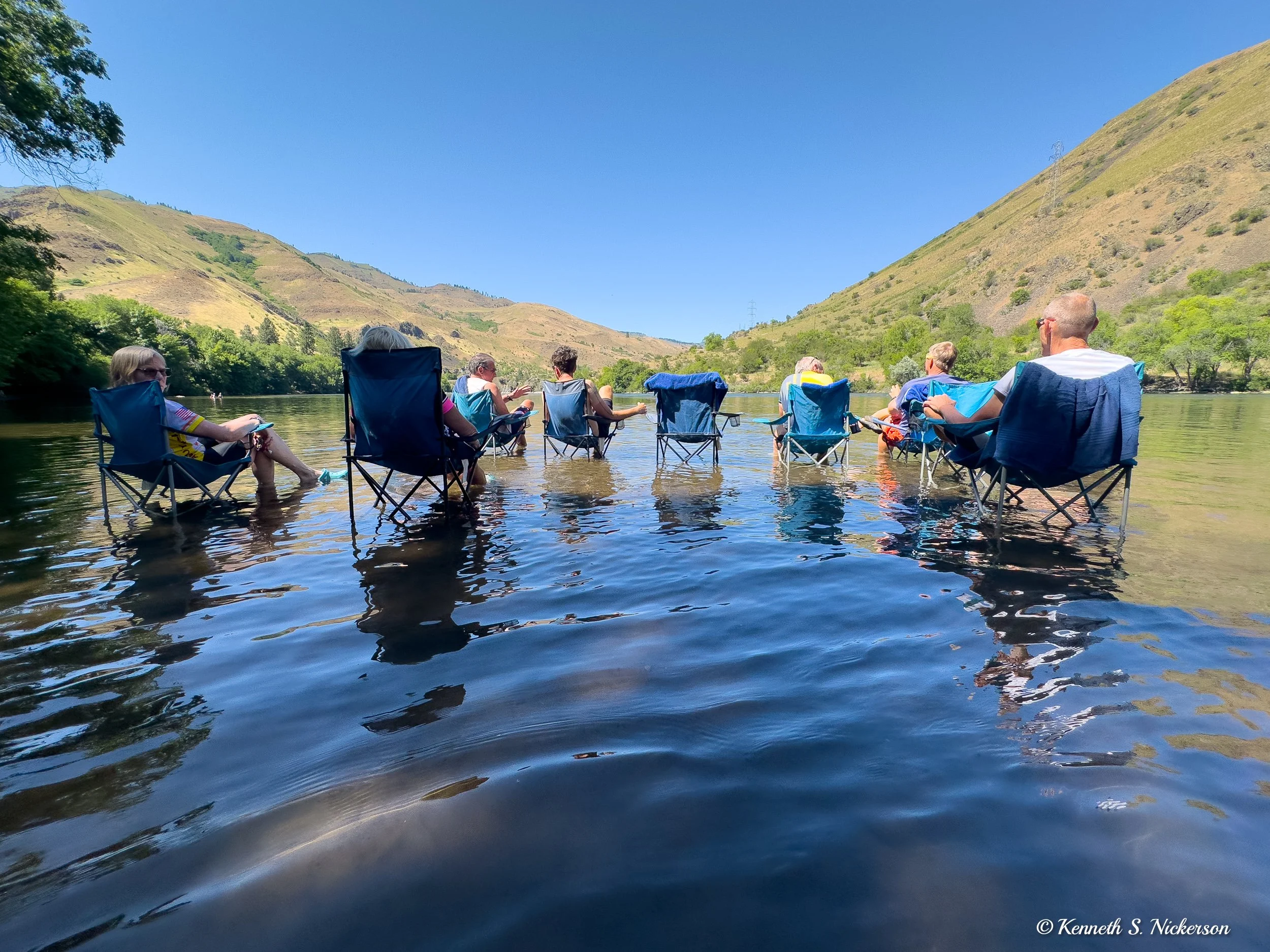 We then continued to retrace our route back to the van at the rest stop at the top of the 600’ climb where we had lunch. As the day progressed, the temperatures got hotter eventually reaching the low 80s. We ended our ride, not back at Halfway, but just after crossing the bridge back to the Oregon side just below the Oxbow Dam. The reason for stopping here was to allow us to wade or swim in the Snake River to cool off. The river water was rather brisk, but felt good to me as I took a short swim before sunning myself in one of the chairs. After 30 or so minutes baking in the sun, I went in for a second swim.