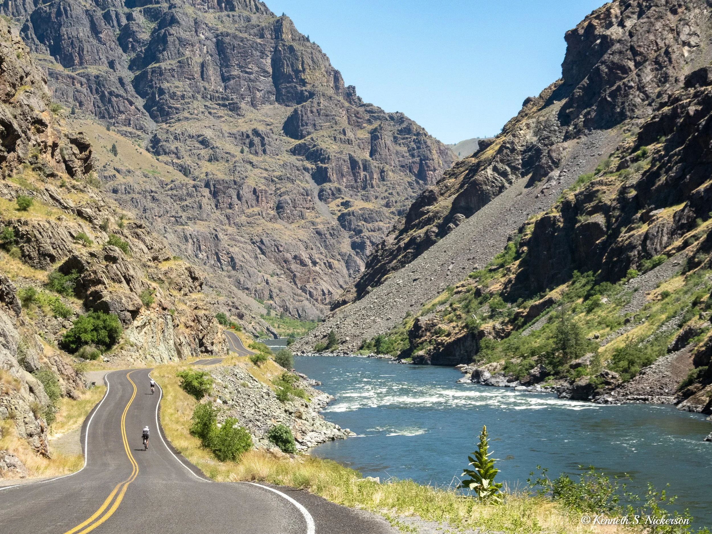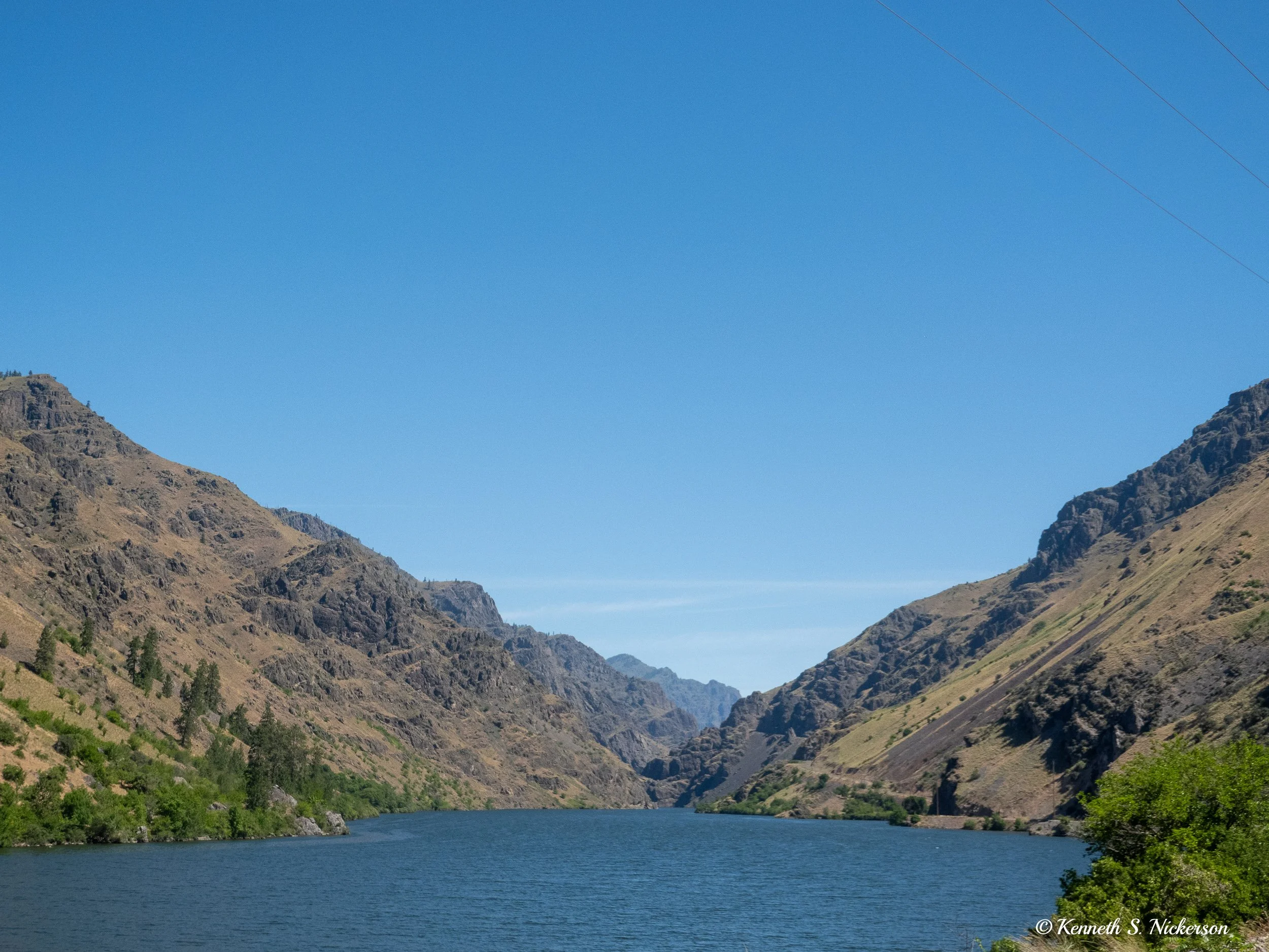 From this rest stop, it was about another 7 miles to get to the Hells Canyon Dam pictured above. I had crossed over the dam, back to the Oregon side, to get here. Yesterday, we ate lunch at the Hells Canyon Overlook which is about 5000’ above this point. The mountains on the Idaho side rise about 8000’ above the dam. When measured from the Idaho side, this makes Hells Canyon the deepest canyon in the US, slightly deeper than Kings Canyon in California and almost 2000’ deeper than the Grand Canyon.