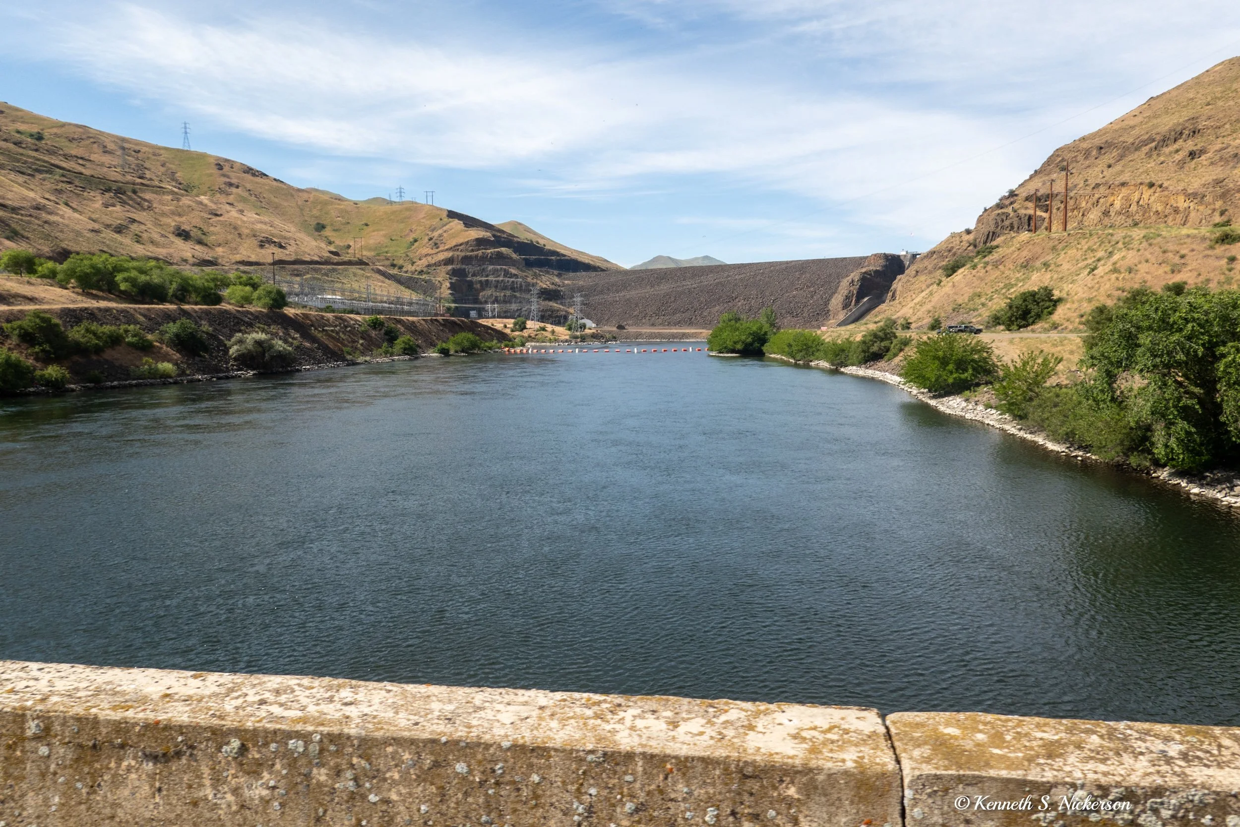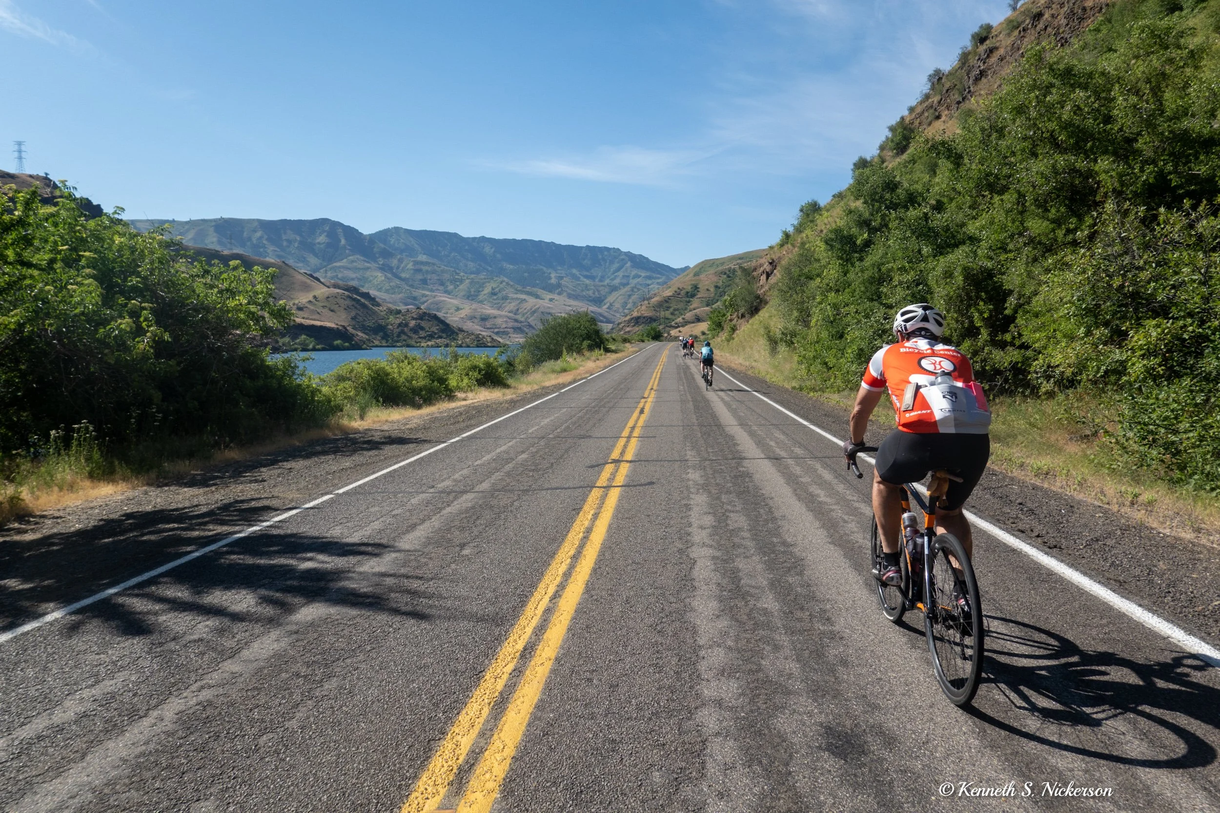 After about 12 miles, we crossed over to the Idaho side of the Snake River just below the Brownlee Dam pictured here. For this stretch, many of us rode in a paceline because of a headwind. I generally prefer not to ride in a paceline on these trips. In a paceline, I need to concentrate on the wheel and rider in front of me. To maximize the energy savings from the draft, I want to have my front wheel very close to the rear wheel of the rider in front. However, the closer I am, the easier it is for the two wheels to touch which would likely result in my crashing. This makes it difficult to enjoy the scenery to the same extent or to do things like take photographs. Consequently, I prefer to ride either by myself or with one or two other riders where we may ride side to side or one behind the other but with ample space. However, the stronger the headwind, the greater the advantage of drafting.