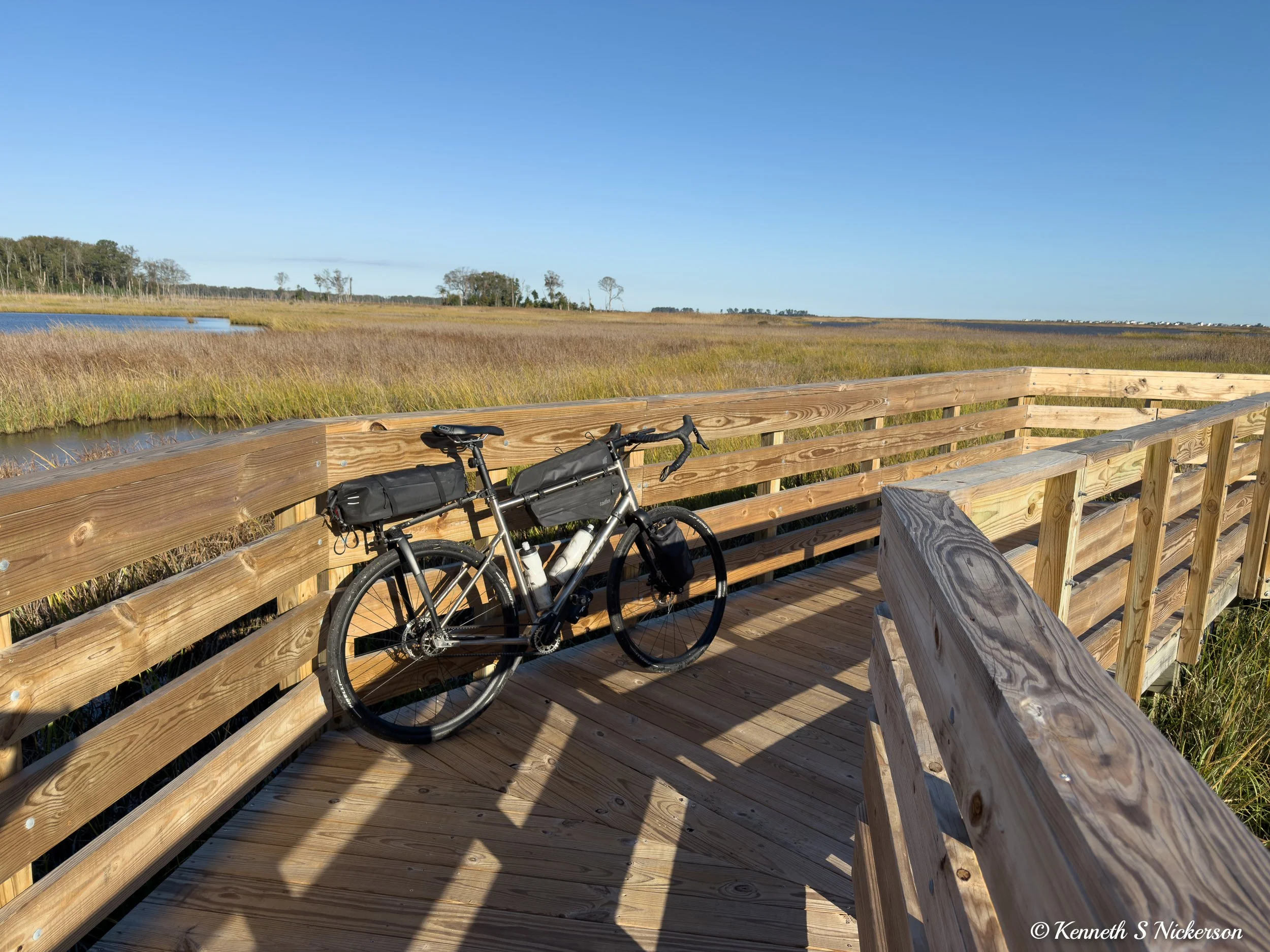 Here is a photo of my bicycle. My rear panniers and my left front pannier are back at the B&B. My big camera and lens go in the top back pannier. The top tube bag stores snacks, my pocket binoculars, and my small camera. The internal frame bag stores bicycle tools such as my pump, a tire pressure gauge, a small retractable cable lock, a ratchet set, etc. Some additional tools are in the small black container below my water bottle. These include plugs for fixing flats, gorilla tape, and an emergency spare tube. Finally, the front bag has my lunch and is a place to store some of my cold weather gear as the temperature warms during the day.