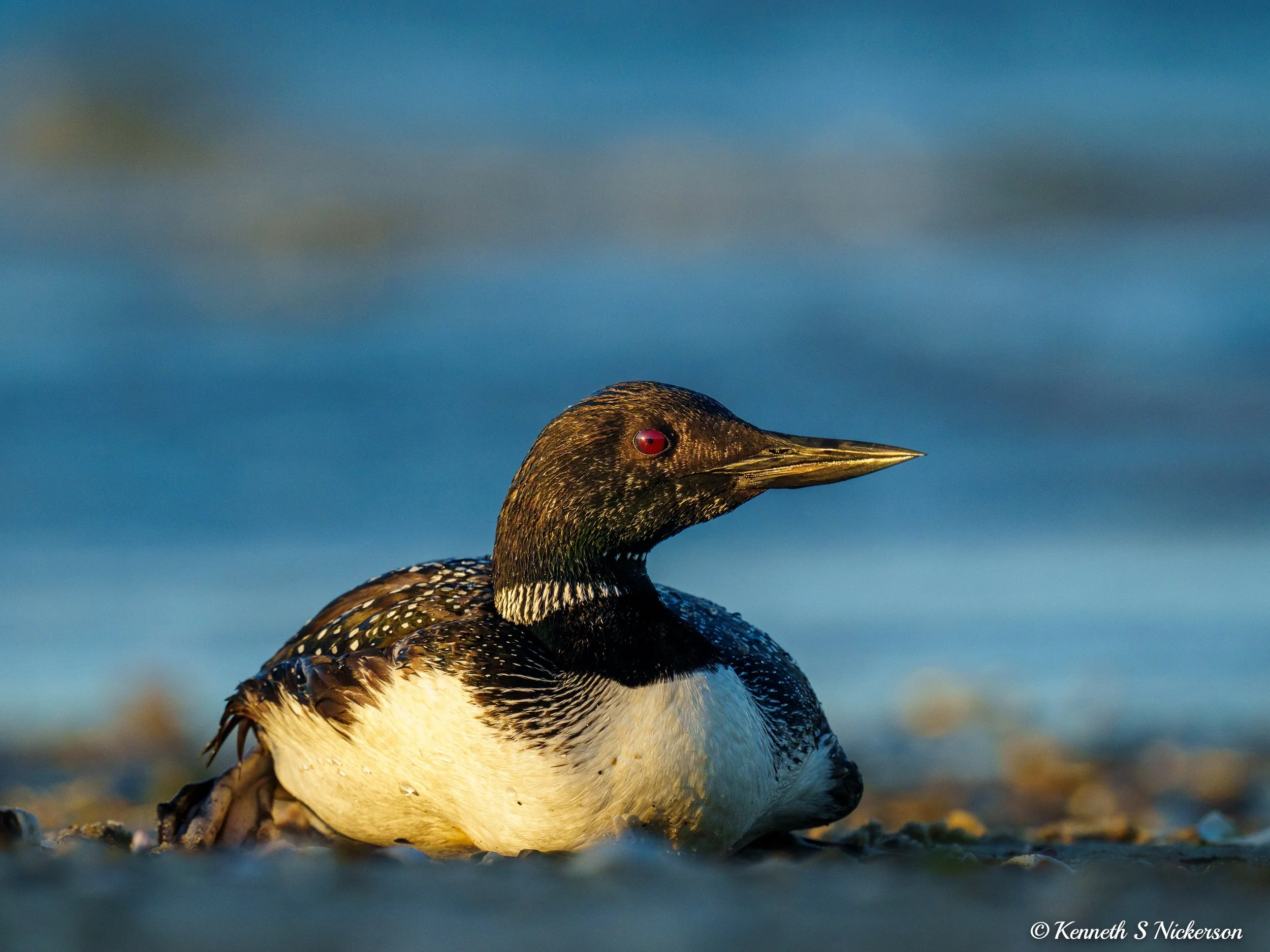 Finally, near where the beach turns to marshland, I came across this Common Loon on the shore. Previously, I have only photographed loons in the water. Loons cannot really walk. They use their rear legs to push themselves forward on their bellies in a slow and awkward manner. Consequently, they are rarely on land. I took care to approach slowly and tangentially so that I got moderately close without scaring the loon.