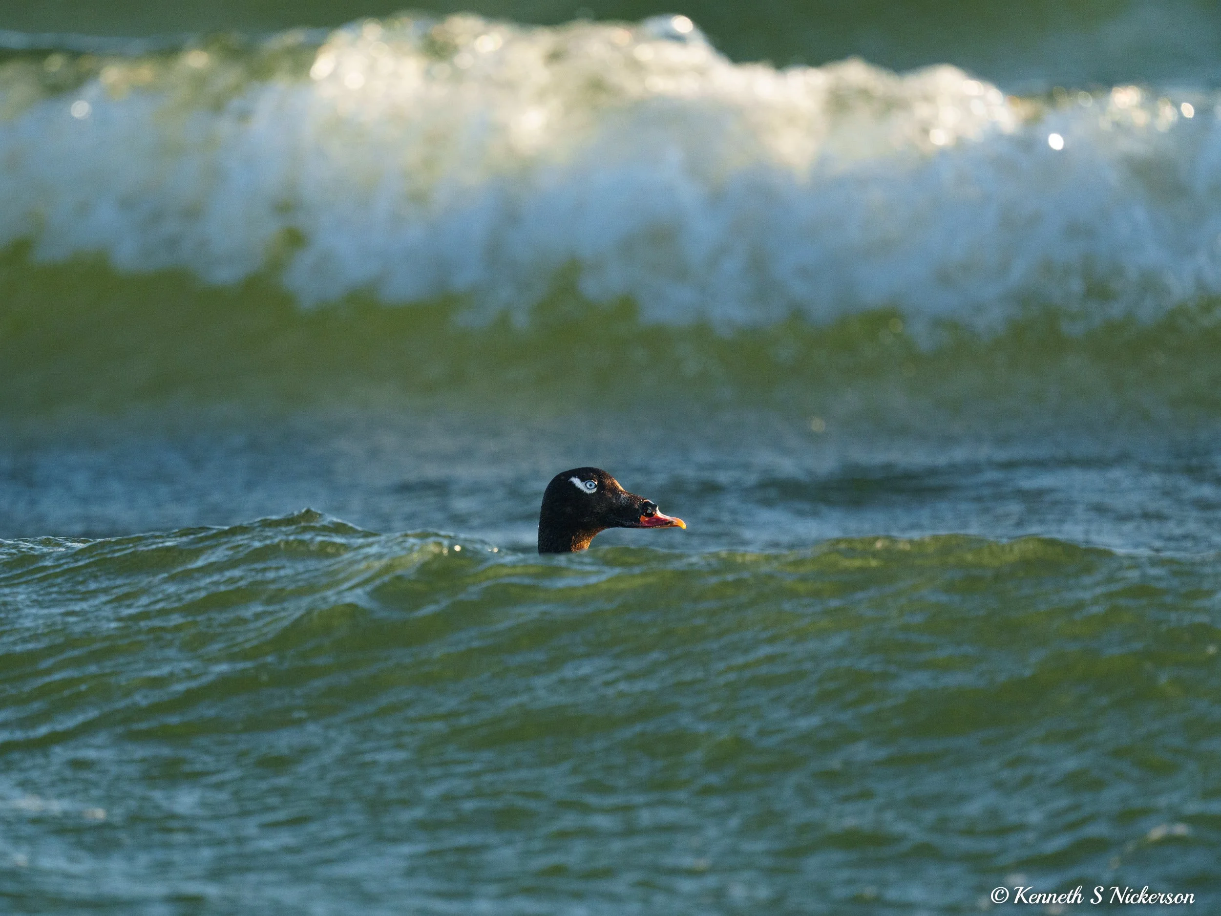 Not much later, I captured this image of a White-Winged Scoter in the surf. With its body behind the wave, the white stripe on its wing, which gives the species its name, is hidden. This image is an example of why I value my big lens. I was lying on the sand just above the waves, so I could not get closer. The bird’s head is only a couple of inches in size, so magnification is necessary to bring it close. The human eye has a field of view similar to a 40mm lens. With my teleconverter, I was photographing at 840mm or about a 20x magnification. With my high resolution camera, I cropped the image to get the equivalent of about 40x magnification.