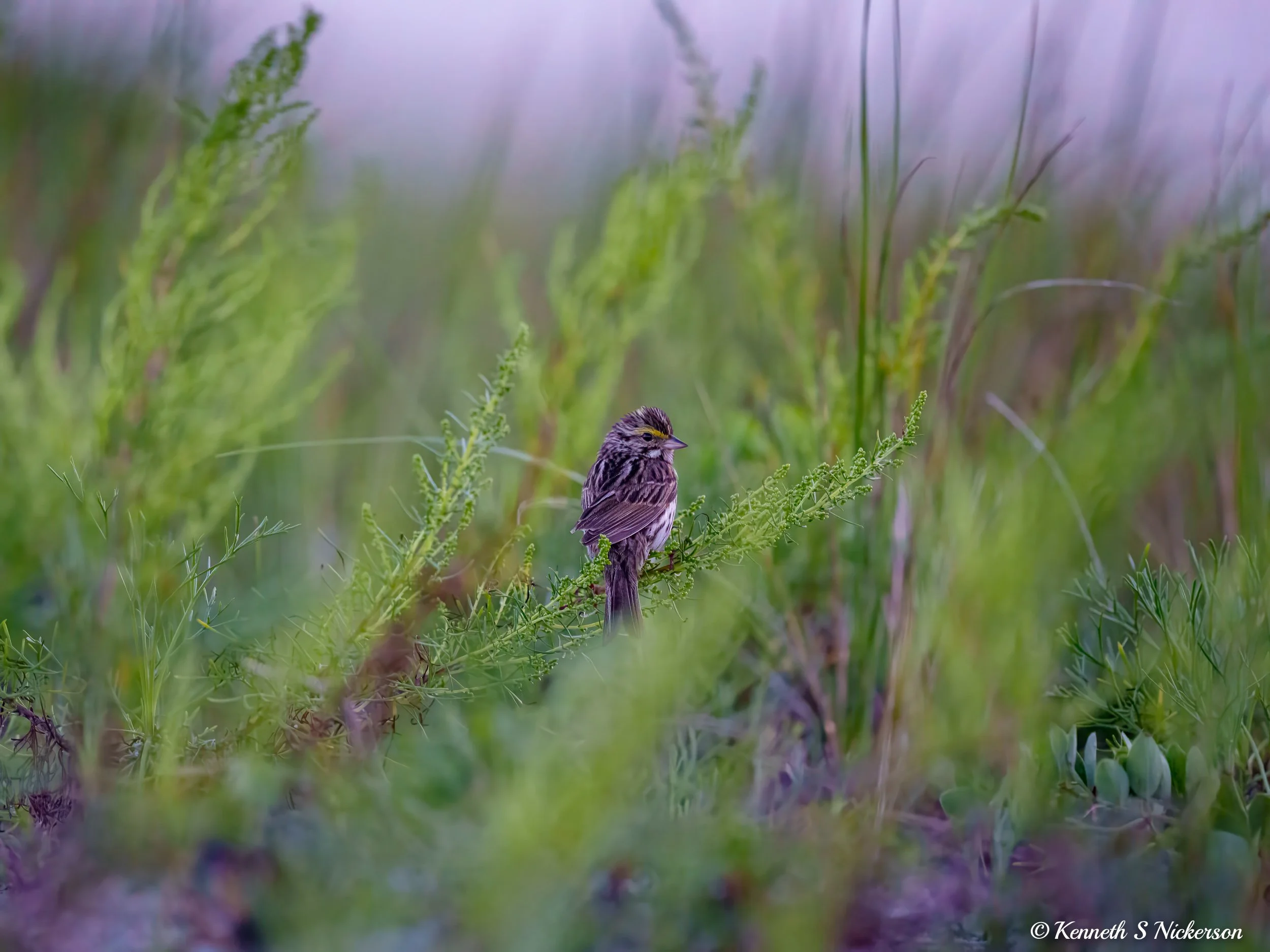Some clouds started accumulating on the western horizon hiding the setting sun. With that, the light faded extremely quickly. I started walking back, taking the inland route through the vegetation. Here a Savanah Sparrow sat on some brush with its telltale yellow marking near its eye clearly visible.