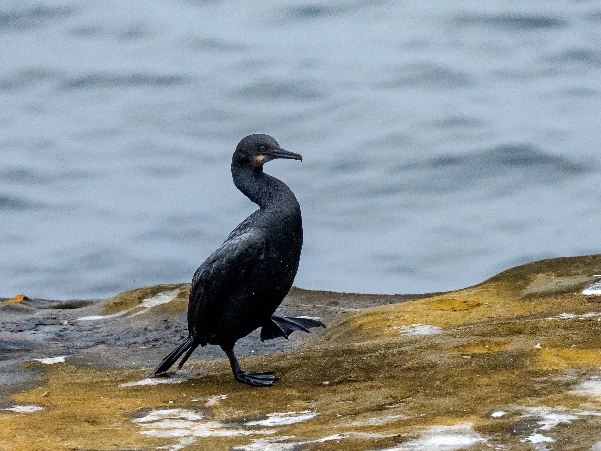 In Chatham, Double-crested Cormorants are very common. During the fall, we will sometimes see migrating flocks as large as several thousand birds flying overhead. While there are some Double-crested Cormorants in San Diego, the more common cormorant is this Brandt’s Cormorant. Compared to the Double-crested that I am used to, it is slightly smaller, has a dark bill, blue eyes, and a blue throat patch (especially visible during breeding season which is earlier in the year).