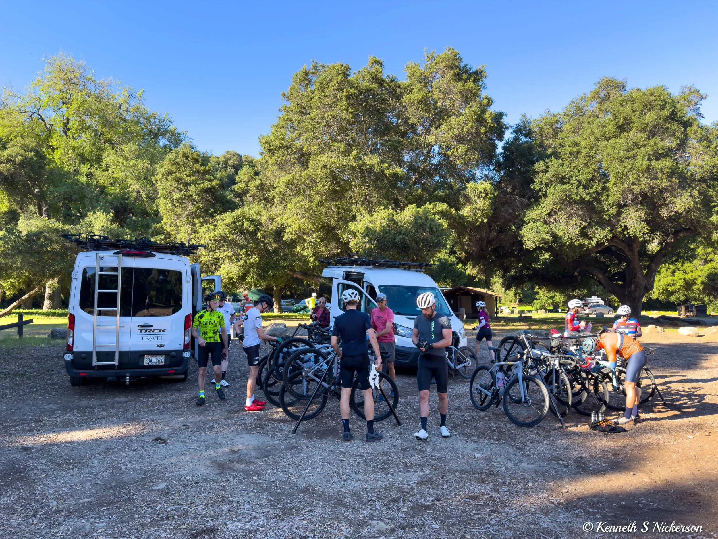 We started the day by driving about 30 minutes south of Solvang. Here we are at a park, getting ourselves ready for the day, putting bike computers on, making sure our water bottles are full, etc.