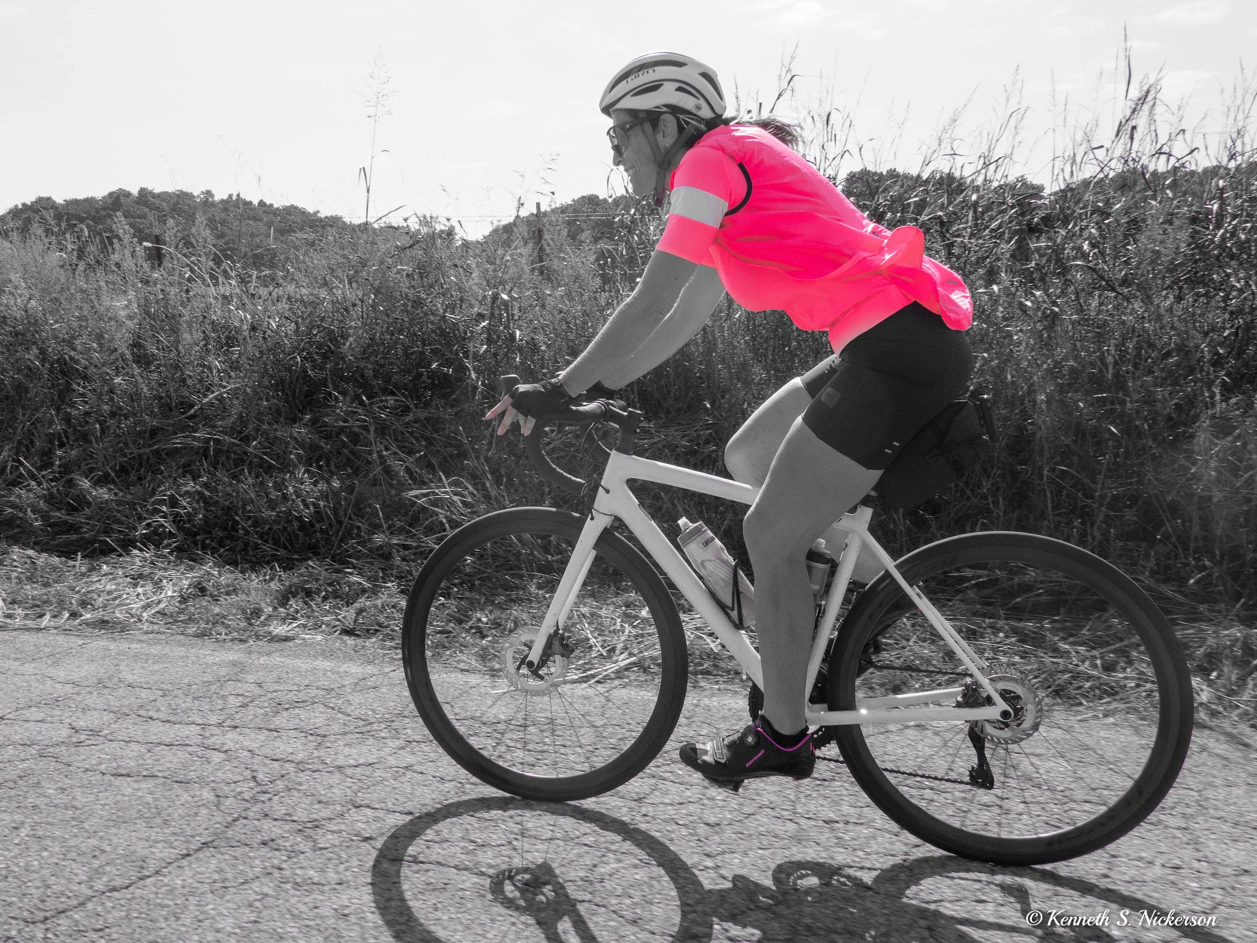 Years ago, when I first met Ruth, she always wore pink. At that time, I took a photo of her on the bike and converted all but the pink into black and white. Then, when Ruth got a new bike neon green highlights in perhaps 2016, she shifted to mostly neon green outfits to match her bike. However, once she got her current white bike, she shifted back to pink. I took this photo today and decided to recreate a version of photo I took years ago. Since I am traveling, I do not have the original photo readily available to compare it.