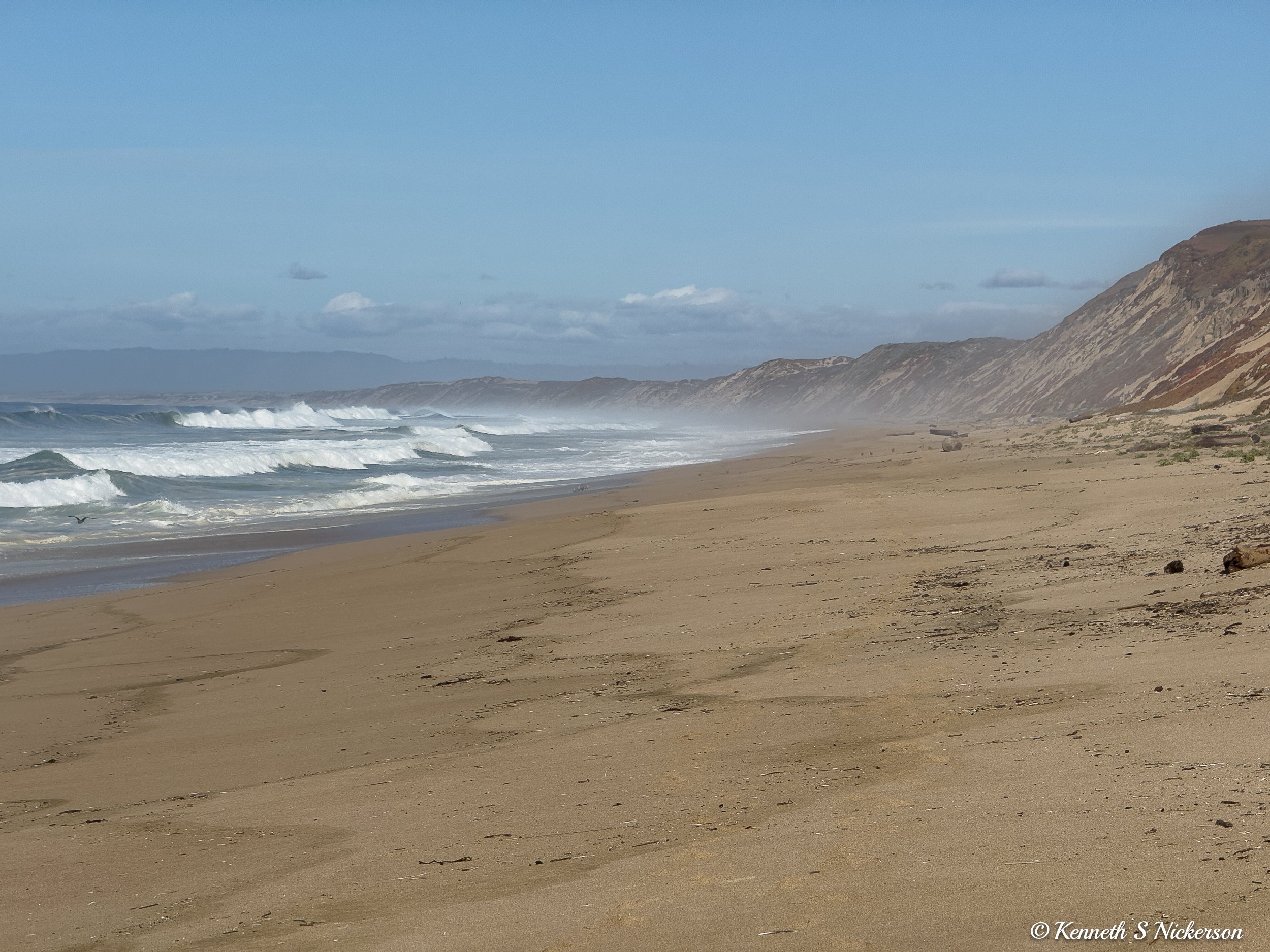 In places, the beach was very flat, so one set of waves might be 30 feet away from us but a slightly bigger set could have us scampering to the side or letting it wash over our toes during the periods when we were barefoot. A larger wave could easily move this wood and roll it up or bring it back down the beach.